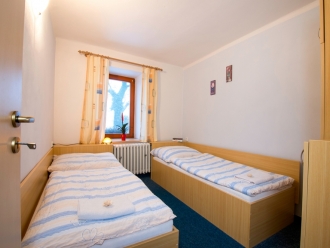 2 x čtyřlůžkové apartmány s vlastní koupelnou, WC a kuchyňkou. Součástí vybavení je mikrovlná trouba, lednice, varná konvice.