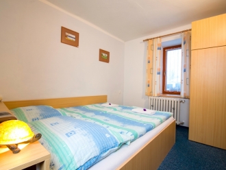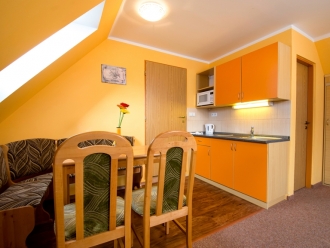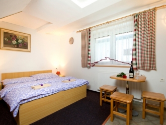 1 x dvoulůžkový apartmán s vlastní koupelnou, WC a kuchyňkou pro přípravu studené kuchyně. Součástí vybavení je mikrovlná trouba, lednice, varná konvice.